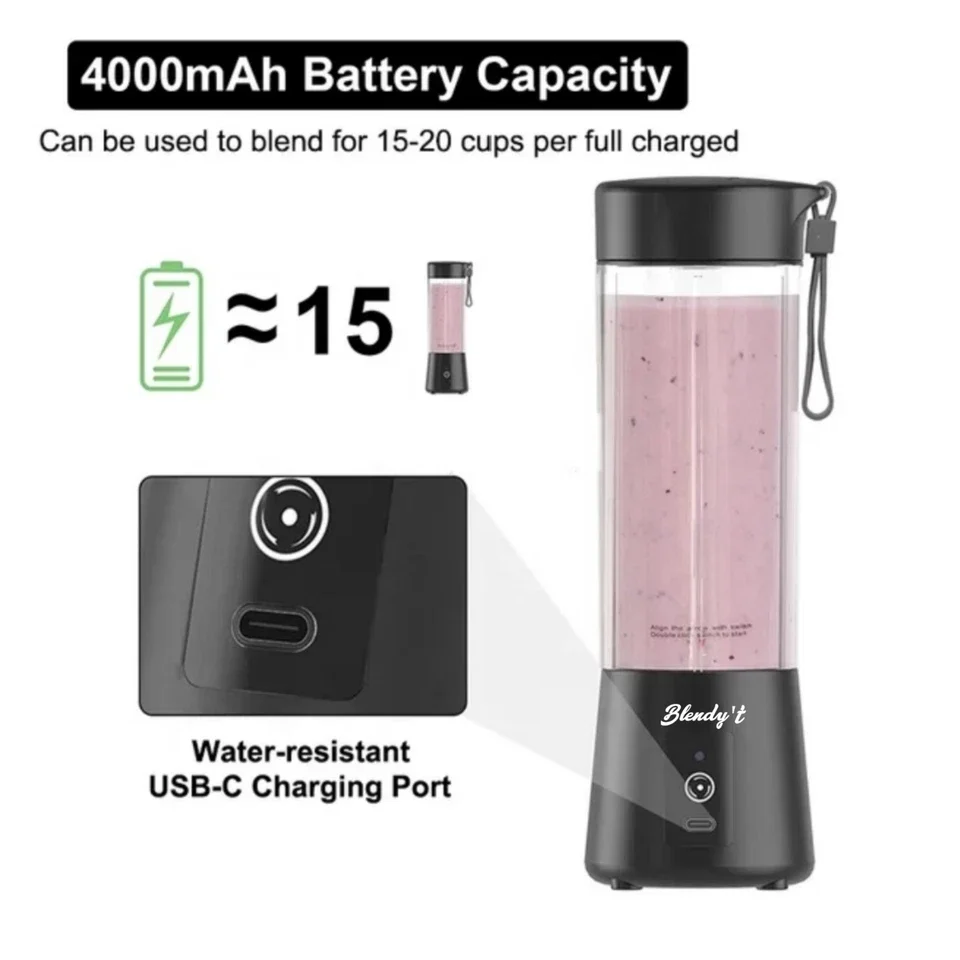 Built-in rechargeable battery charges via power bank, laptop, or plug. Fully charged in 3 hours and lasts for 10–12 blends. -